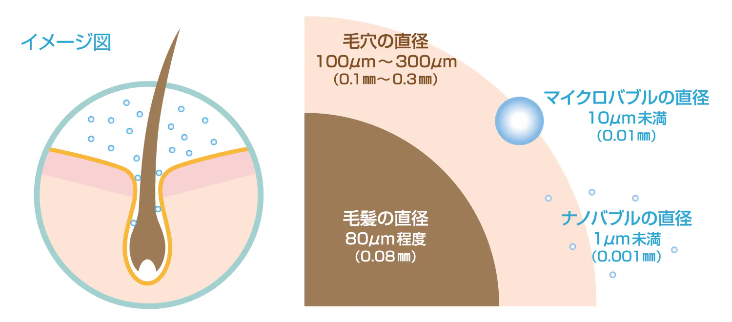 ナノバブルとは、直径約1μm(マイクロメーター)未満の泡で、目には見えないレベルの微細気泡のことです。非常に微細であることから繊維や素材の奥まで浸透することができ、微生物や有害物質を効率的に除去します。大量のナノバブルを含んだナノバブル水は優れた効果を発揮する魔法の水となります。