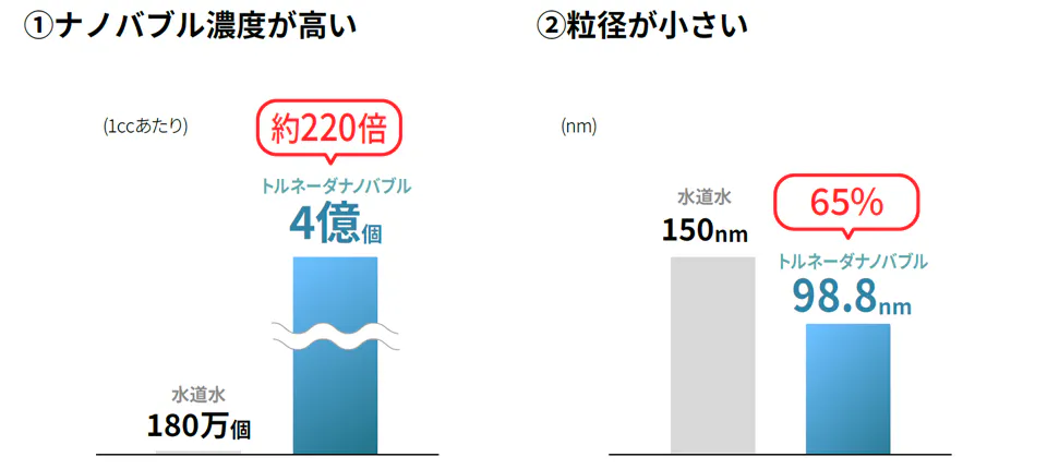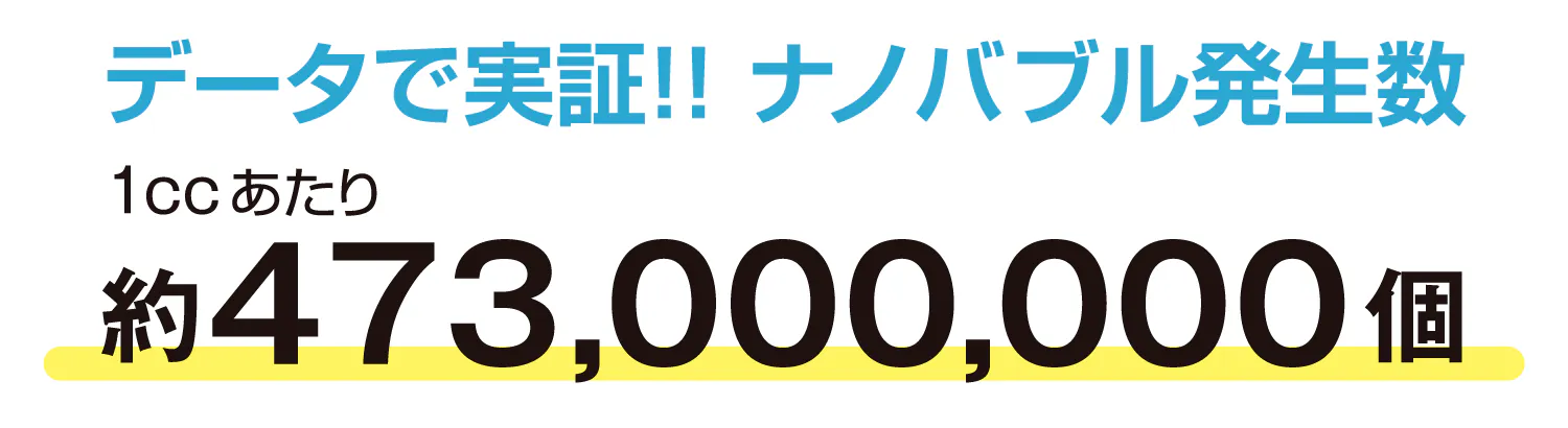 違いはナノバブルの発生数!以前は1ccあたり約1億9,000万個だったのに対し、今回の改良型はその2倍以上!なんと1ccあたり約4億7,300万個ものナノバブルが発生するのです。