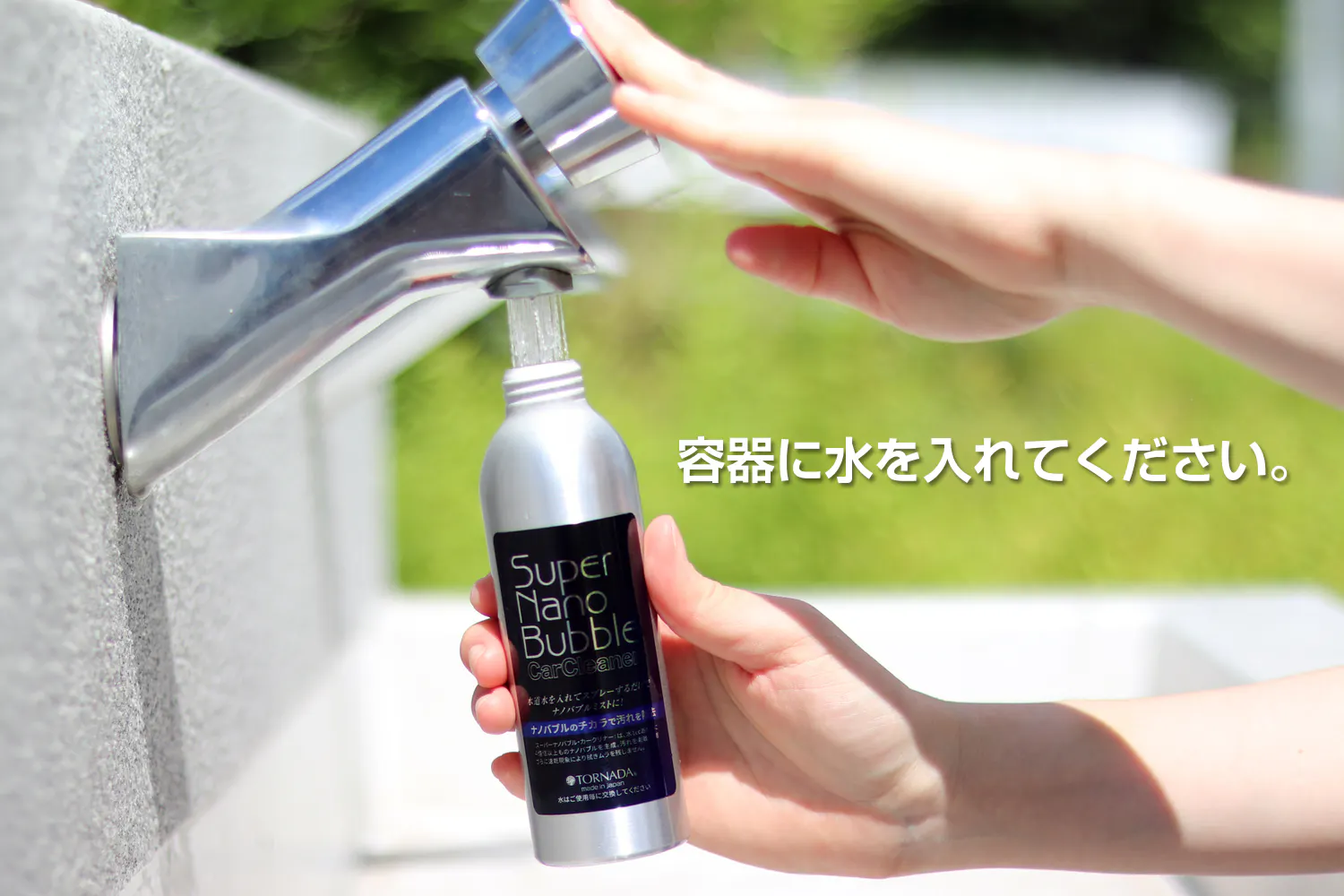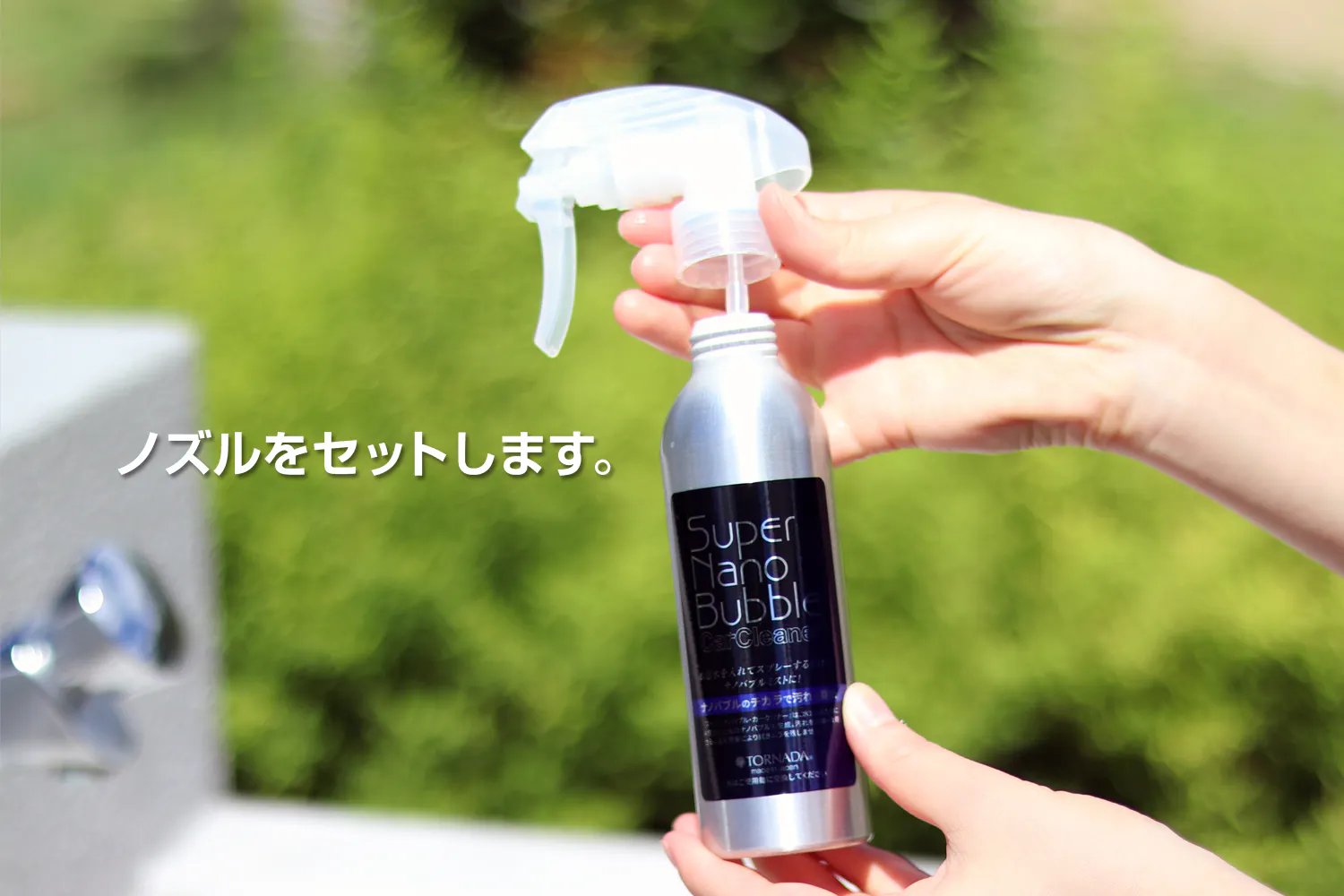 特許技術のナノバブル発生コアが組み込まれた「スーパーナノバブルスプレー」なら、お出かけ先でも水を入れてスプレーするだけで、水道水がナノバブルトルネーダ水となり、サッと愛車をお手入れできます。