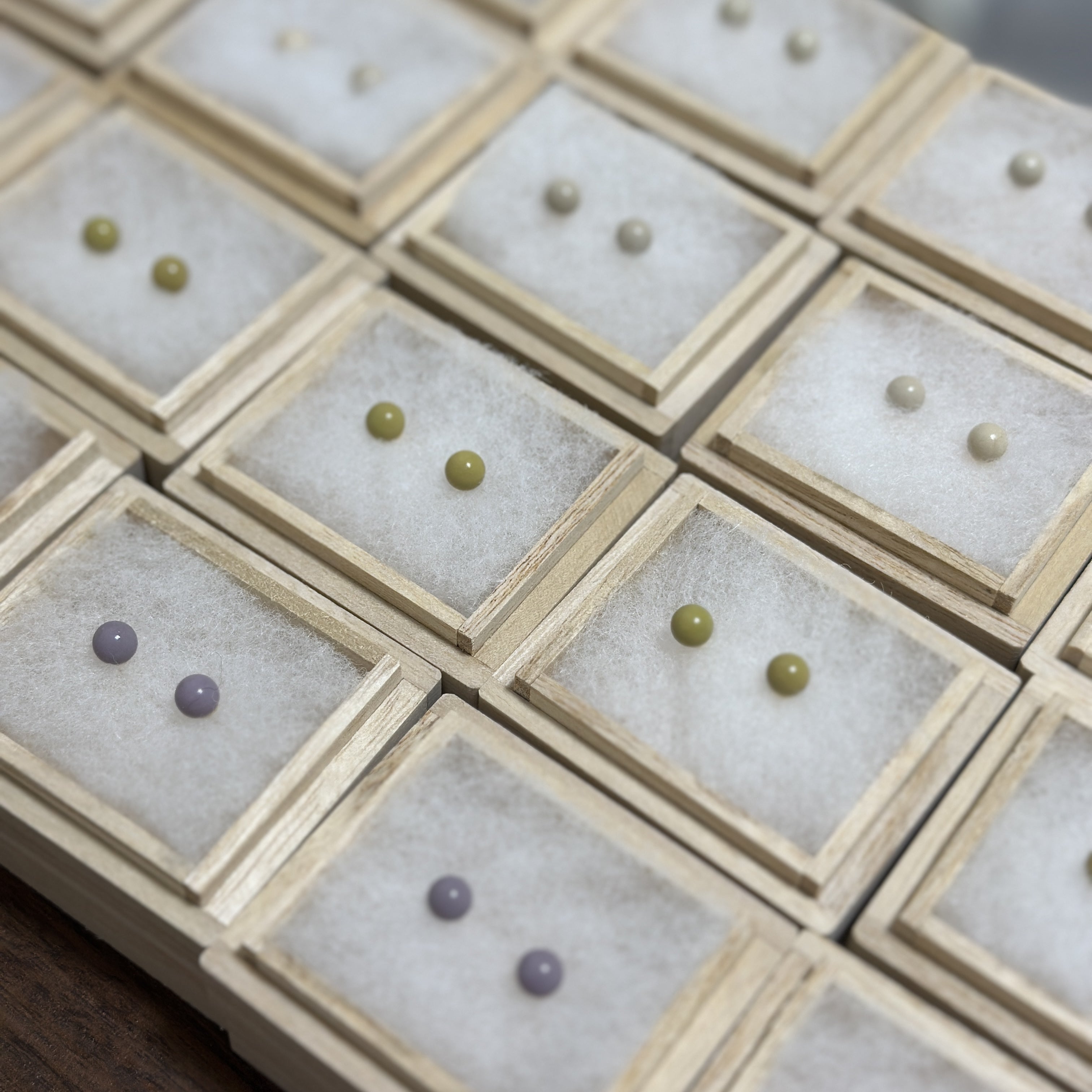今回のピアスの核となる部分は、なんと養殖真珠の元となる真珠核です。この核をアコヤ貝に植え付けて海中に沈めておくと真珠層が巻きついて、真珠が誕生します。その真珠の元となる真珠核に漆をまとわせ、真珠とはまた違う漆の艷やかな輝きの珠にして、ピアスにしました。