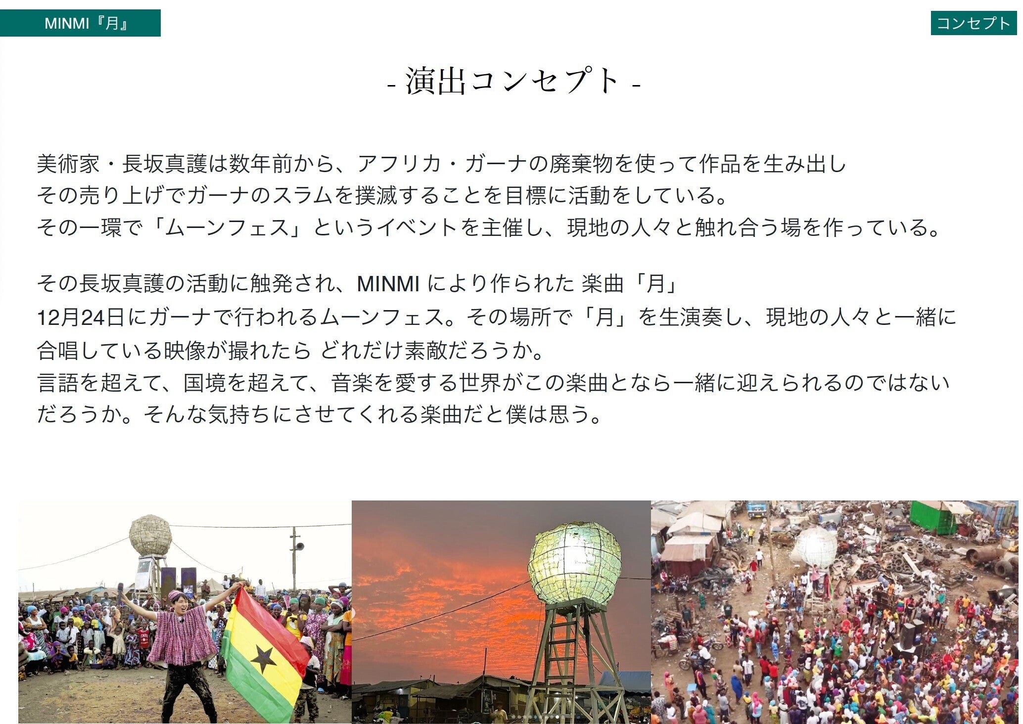 真護も「Tsuki」を気に入り、今年ガーナで開催されるムーンフェスで撮影をしようと提案したことがきっかけとなった。