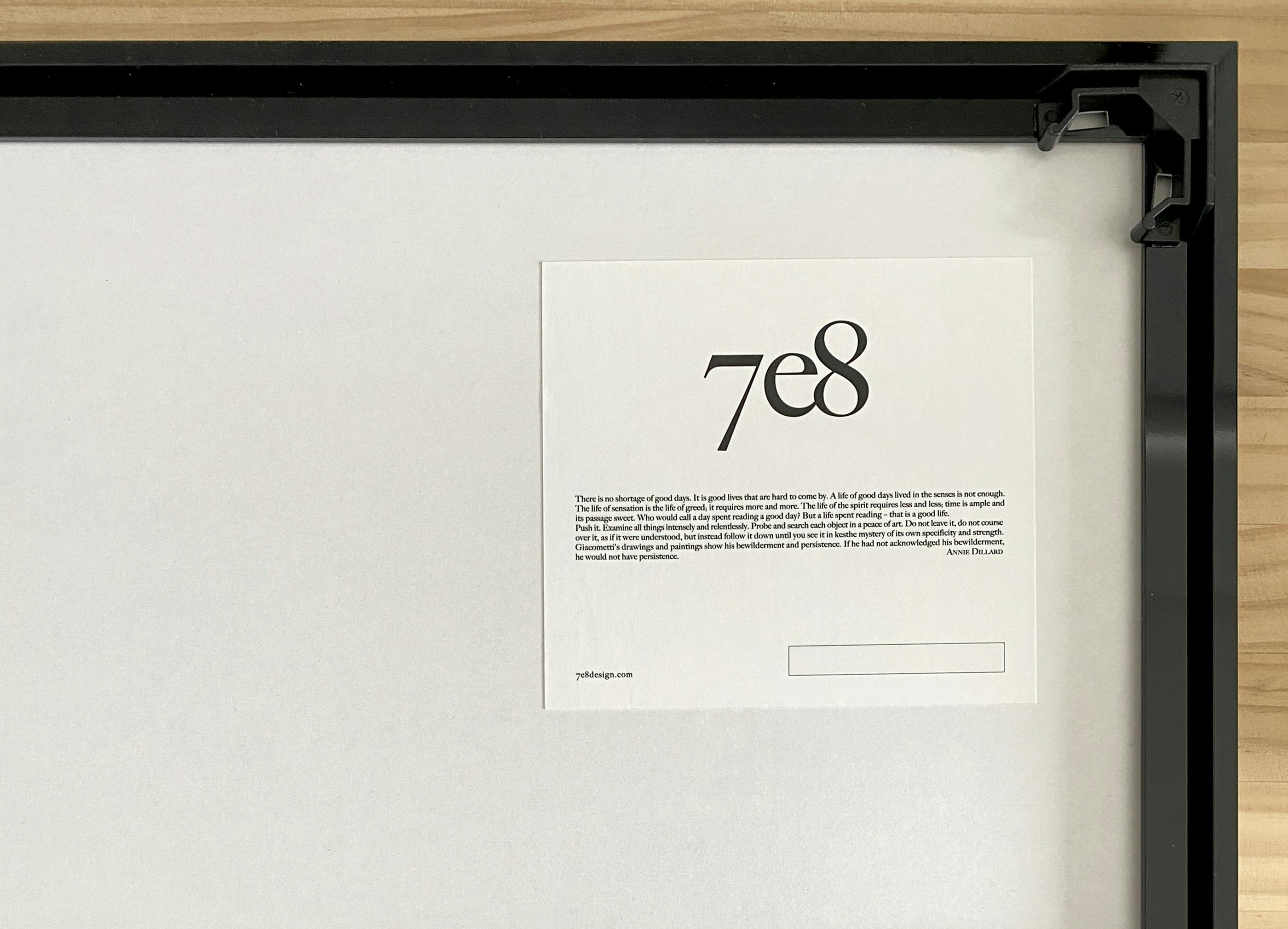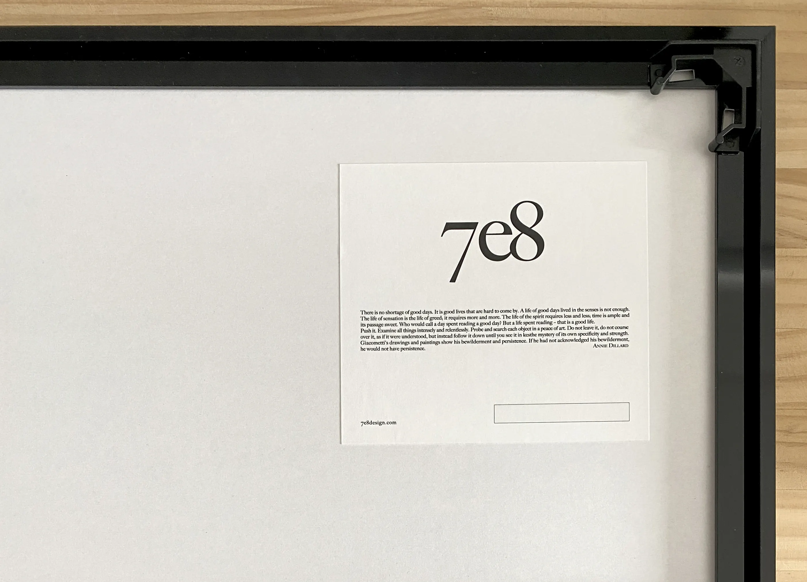7e8デザインにて額装してからお届けする額装は、洋風、和風など、どんなインテリアにも合うシンプルでミニマルなアルミフレームです。