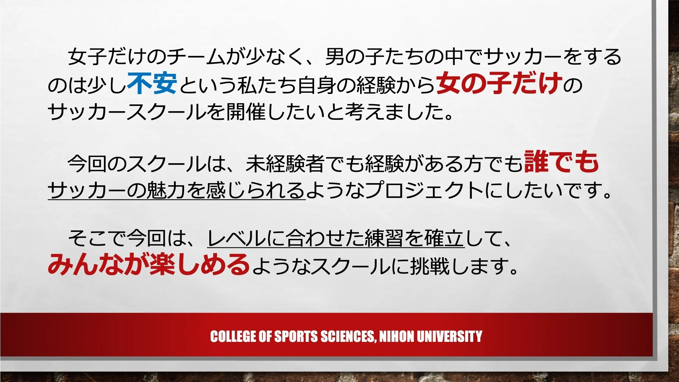 サッカーの状況をみると女の子だけのチームが少なく、男の子たちの中でサッカーをするのは少し不安という私たち自身の経験から女の子だけのサッカースクールを開催したいと考えました。