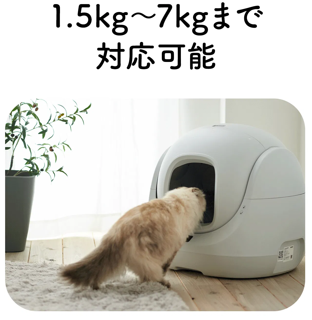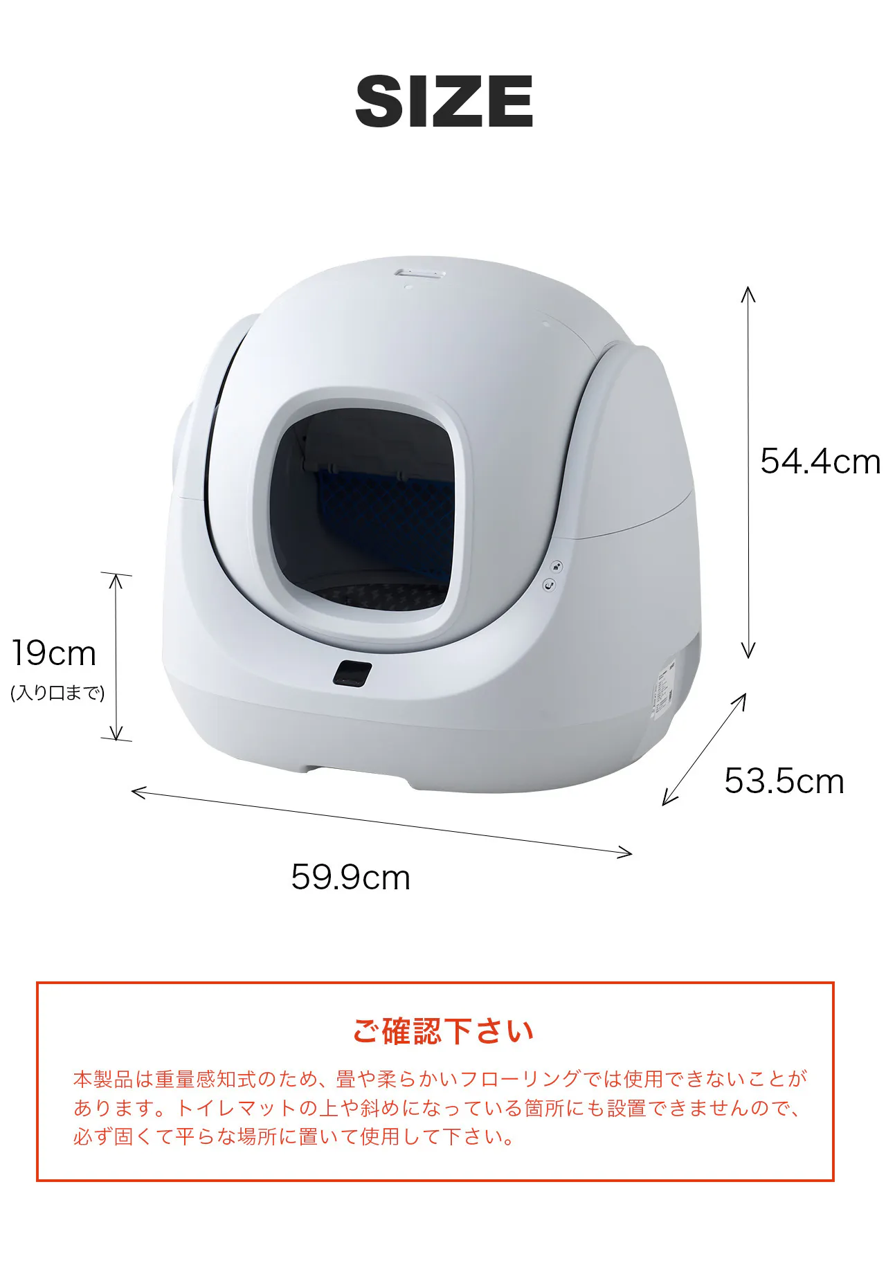 ドーム内の広さは、幅44.8×奥32×高36.6cm。入り口までの高さが低めなので、幅広い猫種に対応しています。※体重1.5kg未満の子猫は電源を入れずにトレーニング用としてご使用ください。