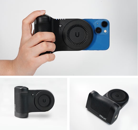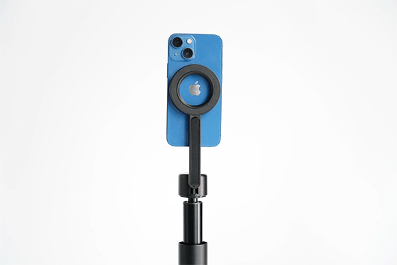 展開するとMagsafe対応のスマホ用三脚に変形することができ、ライブ配信や動画撮影、記念撮影、大人数での集合撮影などの場合、より広い角度で撮影することができます。