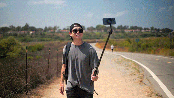スマホをMagSafe対応の丸い台座で簡単固定するだけで、自撮り棒として使用できます。