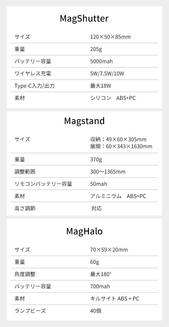 MagShutter×1、Magstand×1、MagHalo×1、USBケーブル×2、日本語取扱説明書×1
