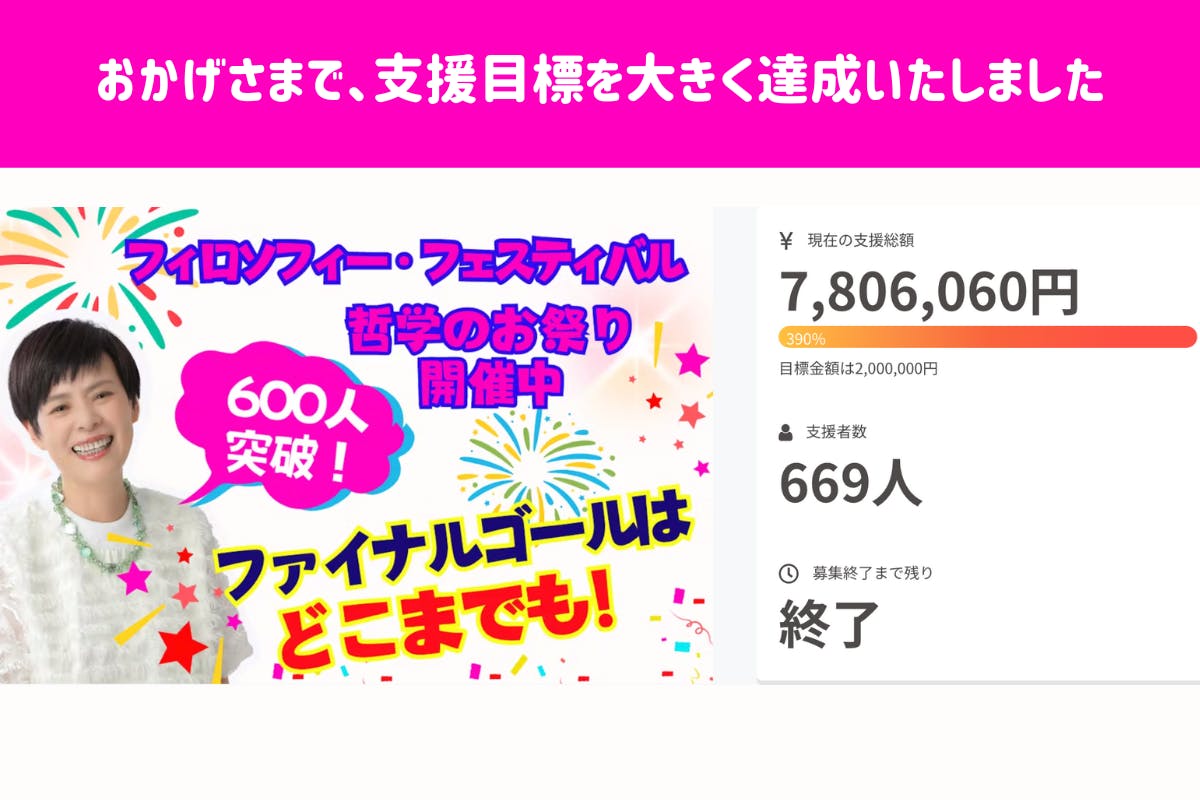 2024/01/29 09:12昨日1月28日(日)23:59をもちまして、約2ヶ月開催をしておりましたクラウドファンディング「フィロソフィー・フェスティバル」が閉幕いたしました。そのご報告とお礼をお伝えさせていただきます。「フィロソフィー・フェスティバル」では、目標人数600人、目標金額2,000,000円を目指しておりましたところ最終的に669名のご支援者より7,806,060円 のご支援金をいただくことができました。当初の目標金額を390%上回るご支援をいただき主催者である堤久美子をはじめ、一般社団法人アイアイ・アソシエイツ事務局運営スタッフ一同、心より感謝を申しあげます。ご支援金につきましては、当初プロジェクトのお約束のとおりに「個の発展」を拡げるためのイベント・講座などの活動や、『超解釈キルケゴールの教え』の販売促進に活用させていただきます。2ヶ月間、ご支援いただいた方お一人おひとりの温かい言葉に励まされゴールすることができました。このフェスティバルの閉幕後も、皆様の中で「哲学すること」が日常となり、誰もが哲学を楽しみ、誰もが当たり前に自分らしく生きる世界をつくるため活動を続けて参ります。本日よりすみやかにお約束したリターンの準備・履行を始めさせていただきます。ご提供や進捗のご報告は個別にメールをさしあげます。最後になりますが、この2ヶ月間、本当にご支援ありがとうございました。 もっと見る