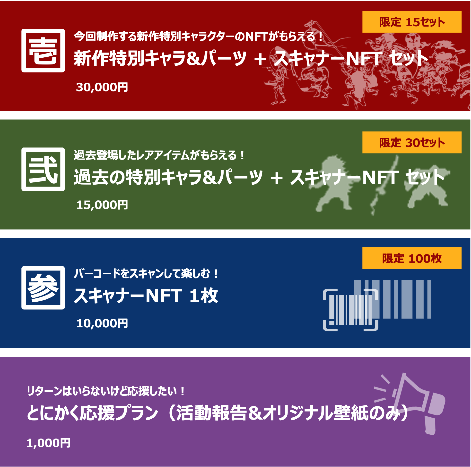 過去のバトルで登場した特別キャラ・武器・防具のNFTがもらえるリターンです。バトル入賞者だけが入手できる特別キャラクターを数量限定でお送りします。バーコードをスキャンして遊べる「スキャナーNFT」1枚とのセットです。