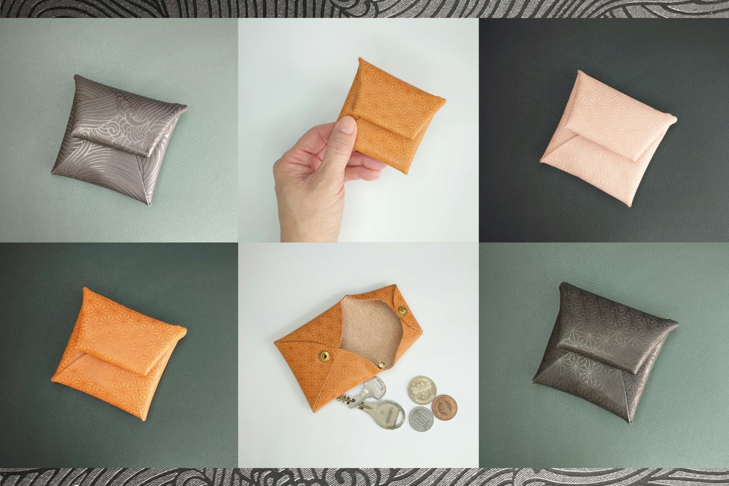今回のプロジェクトでは、3種類の革(カラー)と2種類の小紋柄(デザイン)をご用意しました。