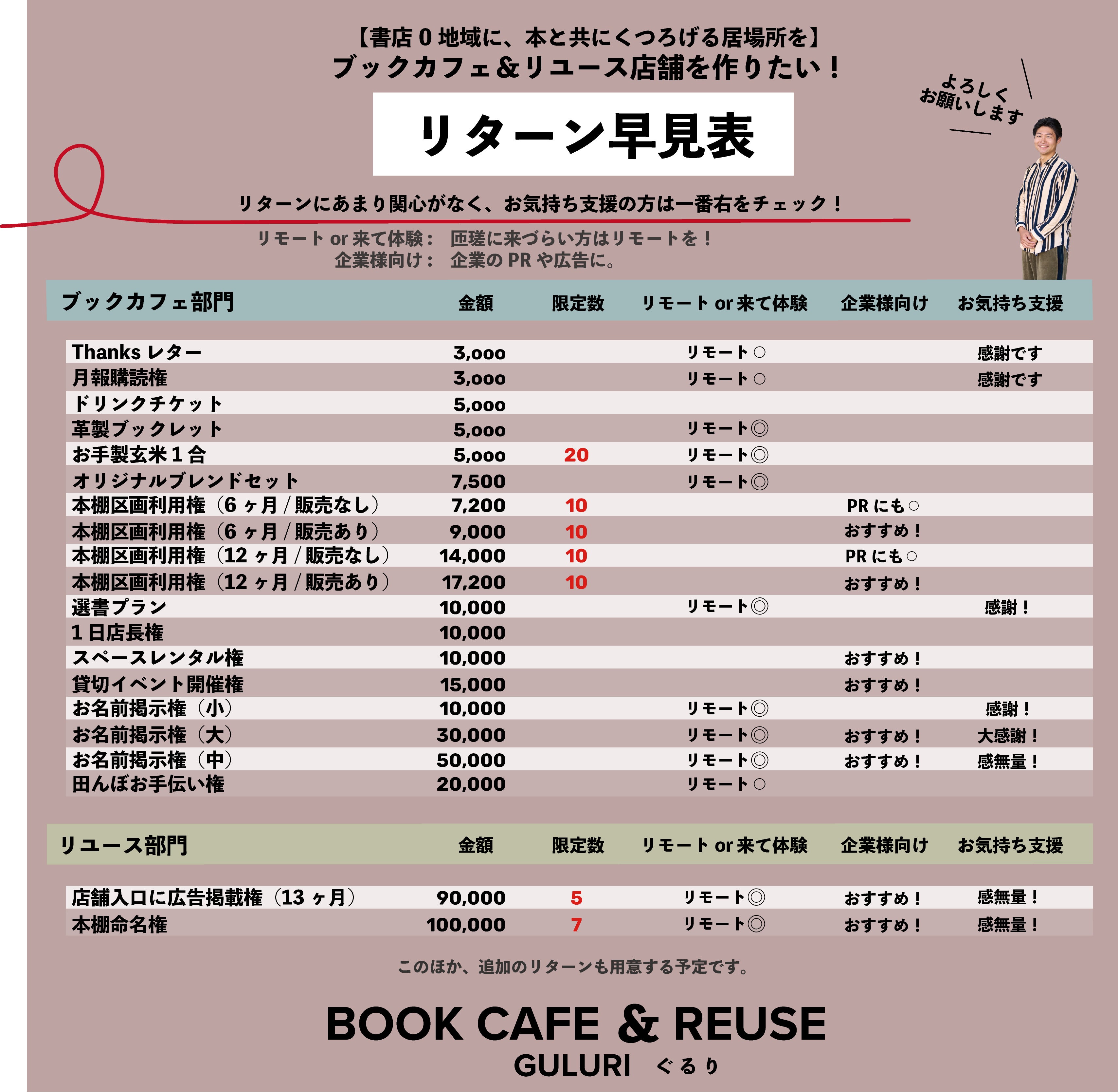 <リターンを早く確認したい方は、下の方にある「リターン早見表」をご確認ください>