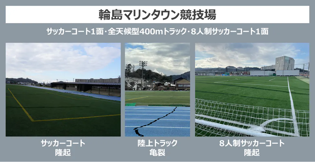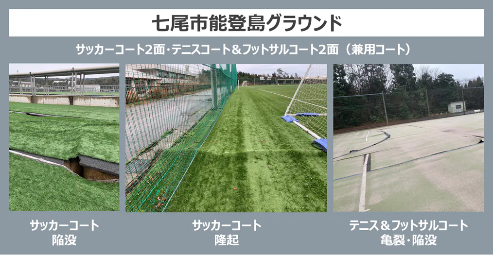 能登半島地震により、北信越地域の10ヶ所以上のサッカー施設が大きな被害を受け、営業再開の目処が立たない状況が続いています。避難生活が長引いている子どもたちは身体を動かしたりして遊ぶ機会を失っており、被災6市町(七尾市、輪島市、珠洲市、志賀町、穴水町、能登町)の24チーム・672人の登録チーム・選手たちは、通常のサッカー活動が困難な状況となっています。