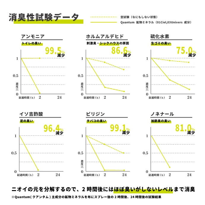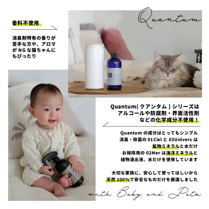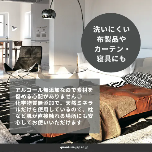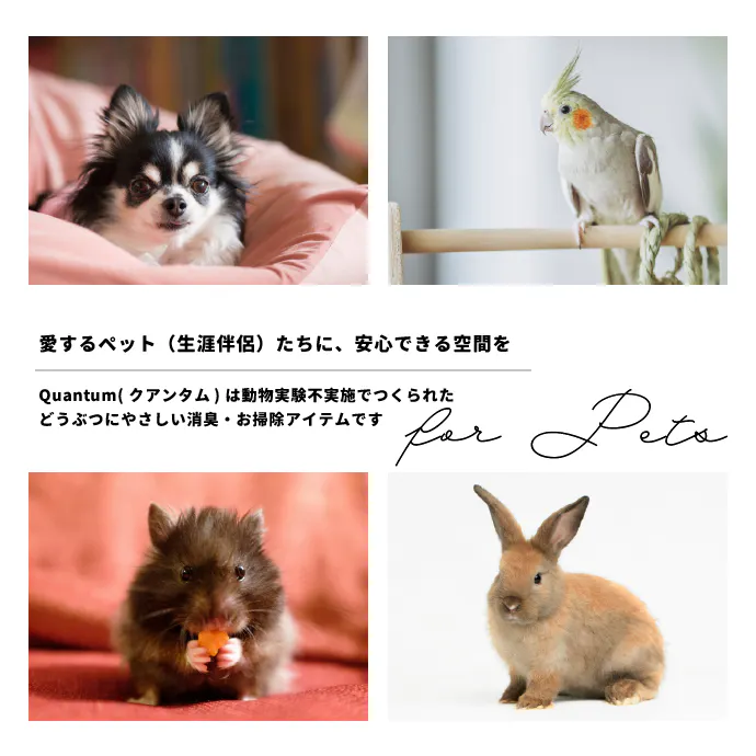 ペットの臭い、脱いだ靴下、夏場の生ゴミなど、ご家庭でもさまざまなニオイの悩みがあるものです。「Quantum(クアンタム)」は消臭対策として、その絶大な効果を確認。 ニオイが出そうな場所にシュッとひと吹き!更に、効果が長続きすることも実験結果より明らかになっています。