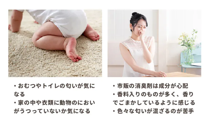 そんなお悩みを解決する、ペットや赤ちゃんが口に入れても安心な、消臭・お掃除グッズができました!