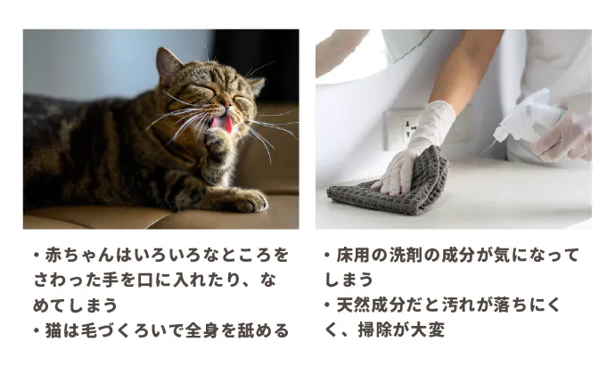猫は、家のあらゆるところに登ったりするので、床や壁、棚など普通の洗剤で拭き掃除をしたりすると、手を舐めたりした時に影響があるのでは?と考えると、何を使えばいいのか心配になりました。