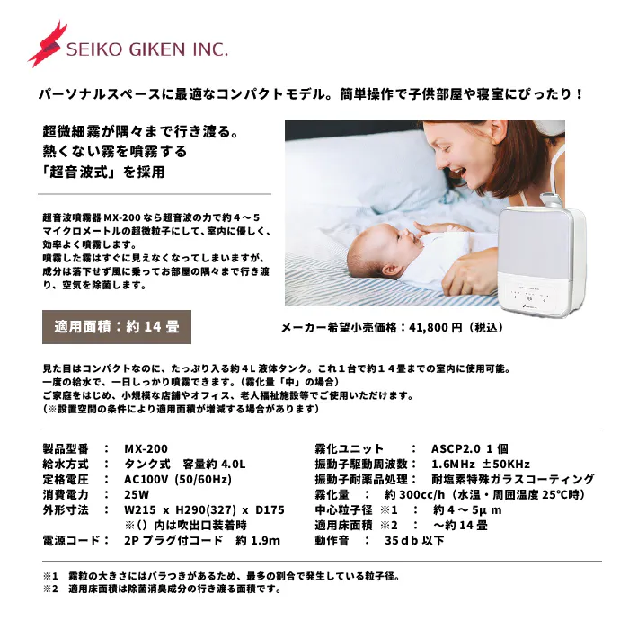 家庭用にお使いいただきやすい、超音波噴霧器「MX-200」と