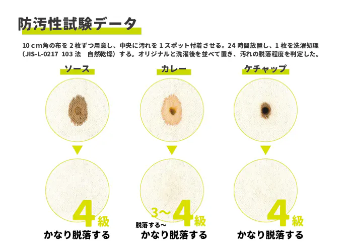 通常のお洗濯で、落ちにくいソース汚れもしっかり落ちる、防汚4級を取得しています。