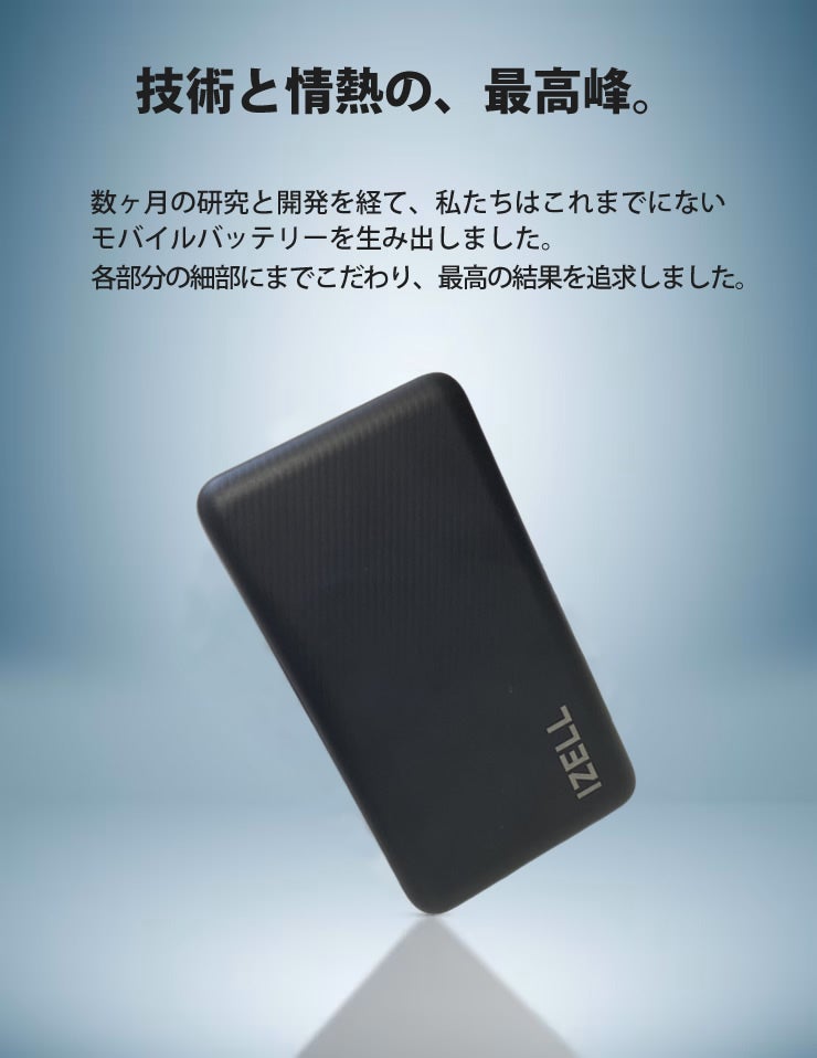 そこで生まれたのが、このモバイルバッテリー「IZELL-505」。たった208gの超軽量設計ながら、ノートパソコンまでフルチャージ可能な65Wの超高出力を持つこのバッテリーは、高度な技術とエネルギー学の理論に基づいて開発されました。