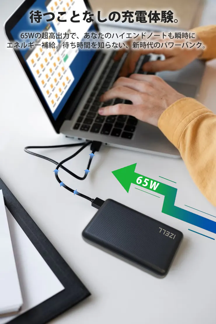 旅行中や出先でバッテリー残量が切れるのが心配なとき、このモバイルバッテリー「IZELL-505」がその救世主となります。65Wの超高出力を持つこのバッテリーは、高性能のノートパソコンも驚くほど迅速に充電します。