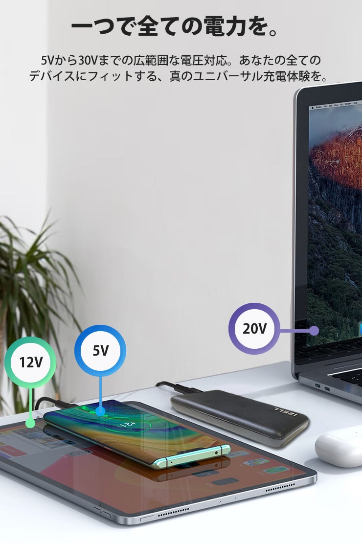 あなたの手元には複数のバッテリーが散らばっているか、もしくは旅先で適切な充電器を持っていなくて困ったを経験したことがあるかもしれません。しかし、このモバイルバッテリーはそのすべてを解決します。5Vから30Vまでの電圧にフレキシブルに対応し、各種デバイスをしっかりとサポート。
