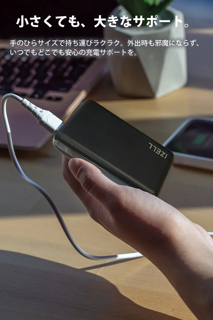 ポケットやカバンにすっと入るこのモバイルバッテリーは、他の多くのバッテリーよりも圧倒的に軽いのが特徴です。重さの負担を感じることなく、移動中にいつでもどこでもエネルギー補給が可能。多くのモバイルバッテリーはその重さから、常に携帯するのが難しい場合がありました。しかしこのモバイルバッテリー「IZELL-505」は従来のものより遥かにに軽い208g。バッテリーの重さを気にすることなく、気軽にカバンに入れて持ち歩くことができます。