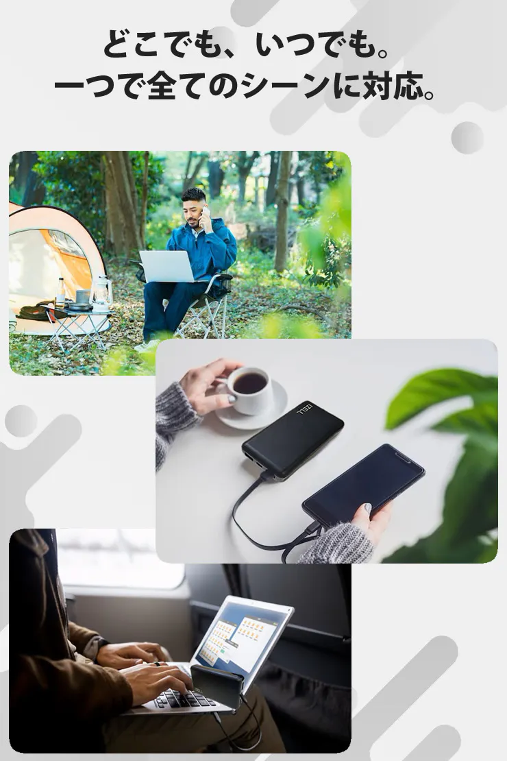 カフェでの短いブレイクの間にも、大切なデバイスをしっかりとサポート。緊急のミーティングやプレゼンテーション、大事な業務中にも電源を切らさず、あなたのビジネスを常に最前線で支えます。