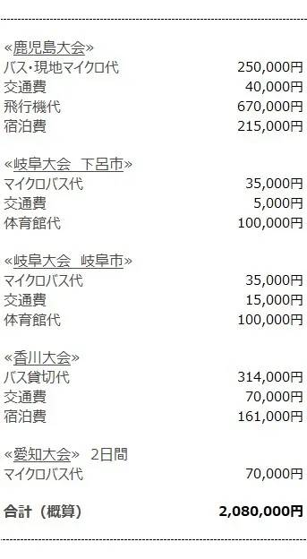 皆様からご支援いただいた資金は、本プロジェクトの手数料、リターン品に係る経費を差し引いた金額を主に、以下の試合の旅費・宿泊費などに使用させていただきます。