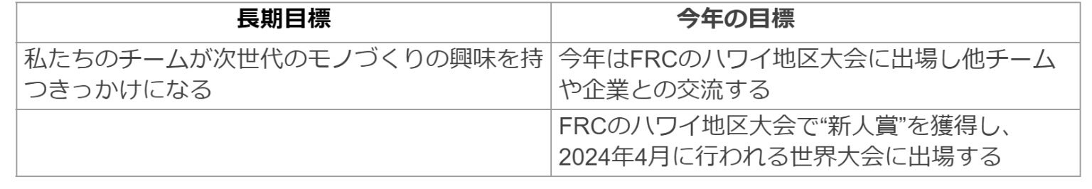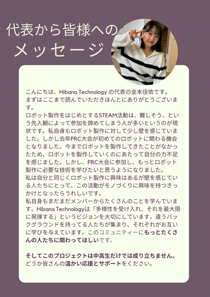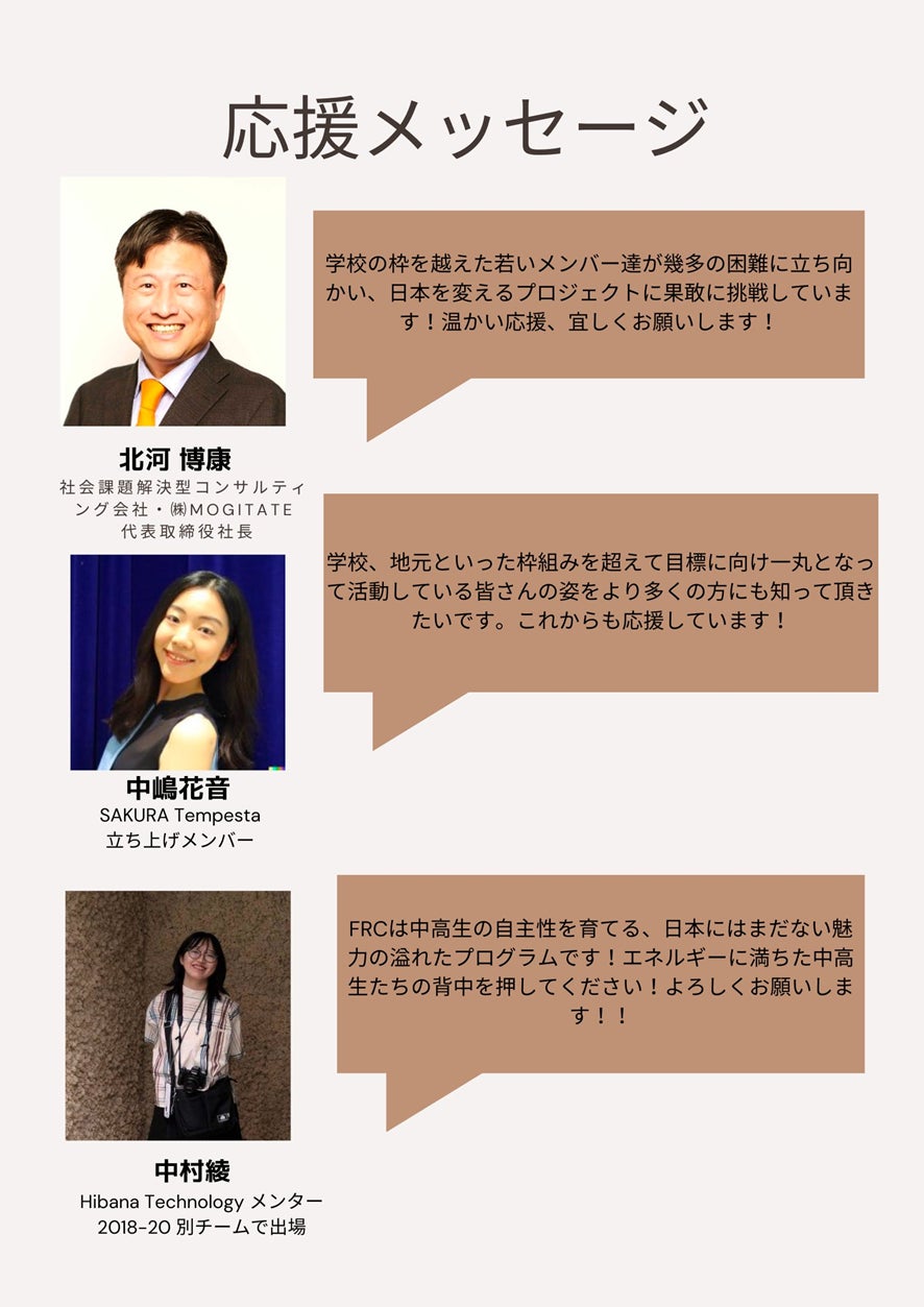 日本の若者による若者に向けたSTEAM教育の啓発活動の第一歩であるFRC大会出場、そして新人賞受賞という大きな夢を叶えるための支援を是非お願いしたいです。