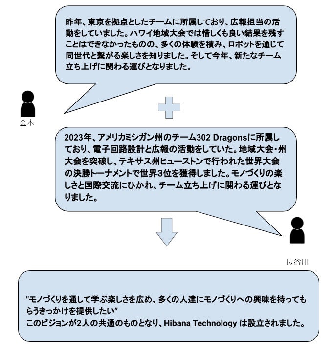 私たちHibana Technologyは、ロボット製作の経験の有無に関わらずモノづくりを協働して行う優しいコミュニティを作ります。教育現場、特に次世代にものづくりの楽しさを広めます。その過程でSTEAM教育の啓発と広がりを最大の目的とした、世界最大のロボコン、FRCにチームとして出場します。