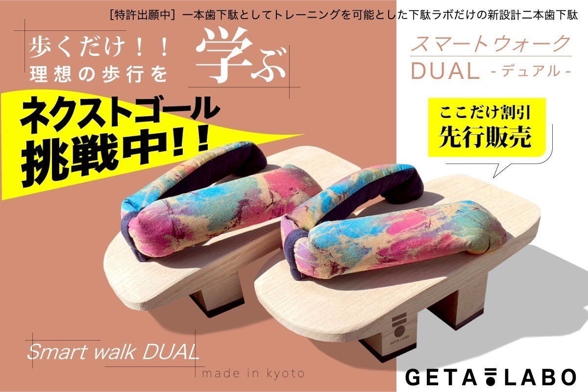 そんなGETA LABOから、下駄でのトレーニングが初めての方でもウォーキングなどに気軽にチャレンジいただける下駄として開発した2本歯下駄「スマートウォークDUAL-デュアル-」のご提案です。