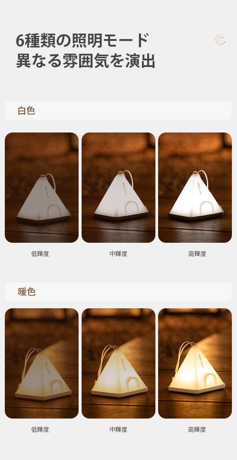 暖色/白色の2つの色、3段階の明るさ調整の合計6つの照明モードを搭載しており、シーンに合わせた照明を使い分けることができます。