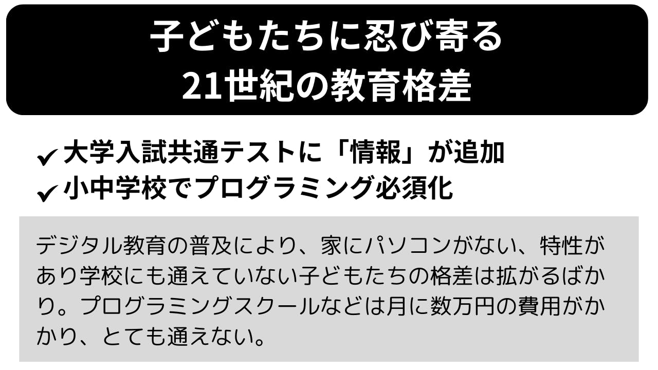 社会のデジタル化が進むいま、子どもたちに忍び寄る「21世紀の教育格差」は深刻化しています。不登校・グレーゾーン・貧困・シングルペアレントなどの複合的困難に身を置く子ども達でも、好きなだけ学べる環境を得ることで、人生を切り拓いていくきっかけになります。