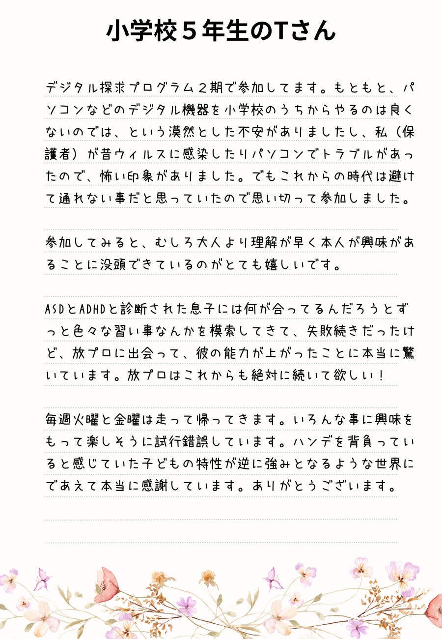 作品を通して親子の会話が増えたり、そういった子どもの変化から、保護者の方から「自分もプログラミングを学んでみたい」という意欲も引き出すことにも繋がっています。そんな子ども達や保護者さんから届いたメッセージの一部をご紹介いたします。