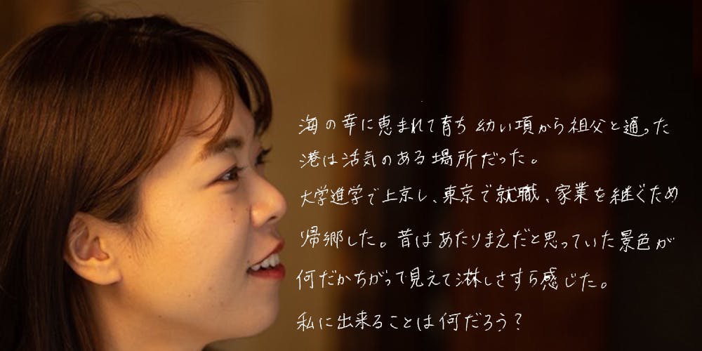 大学進学で上京し修行のために東京築地市場に就職(現在の豊洲市場のこと)。男性社会の水産業界では珍しい女性営業マンを夢見て入社しましたが配属されたのは総務部でした。やりたいことが思うようにできなかったOL時代に区切りを付けて家族が待つふるさとに27歳の時に戻りました。
