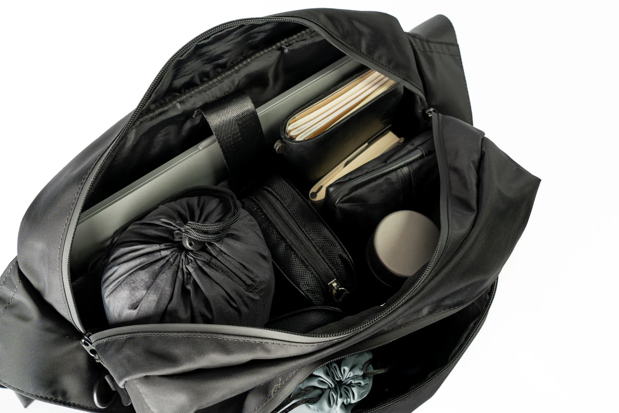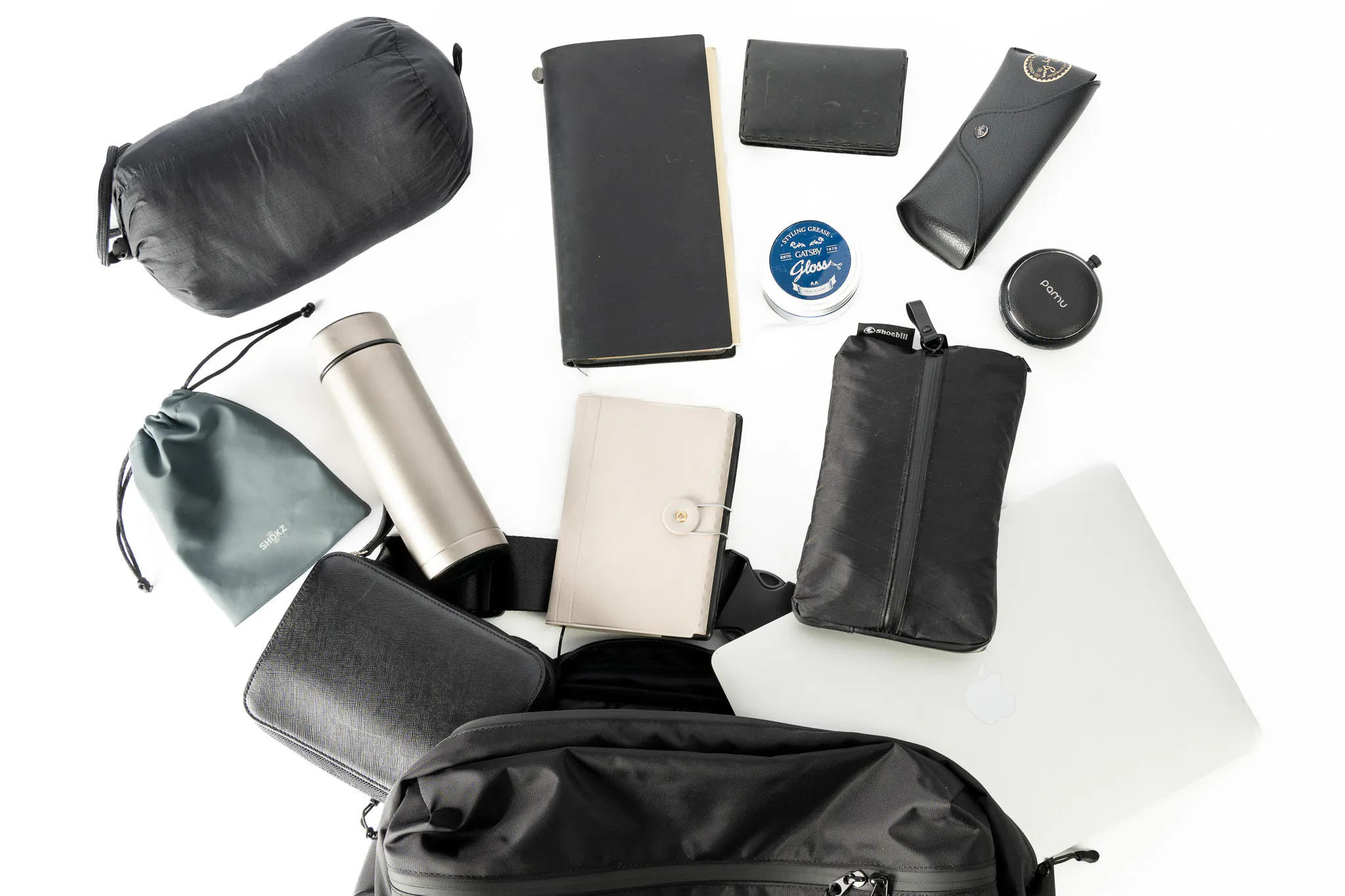 一度に収納できるアイテムは、ノートPCに手帳、ポーチ、水筒、眼鏡ケースほか盛りだくさん。 “ちょうどいい”を体現したサイズ感でも、都市生活に必要なアイテムがすっきりと収まります。