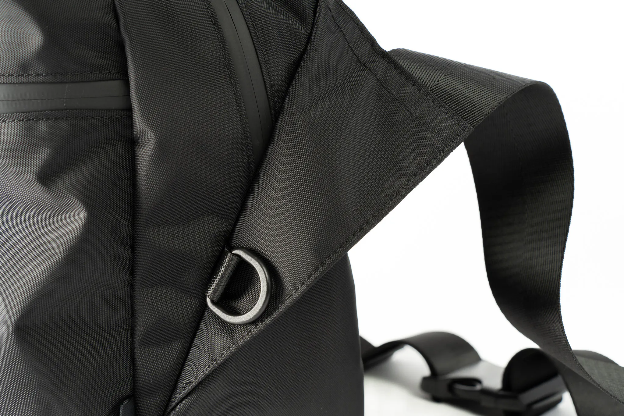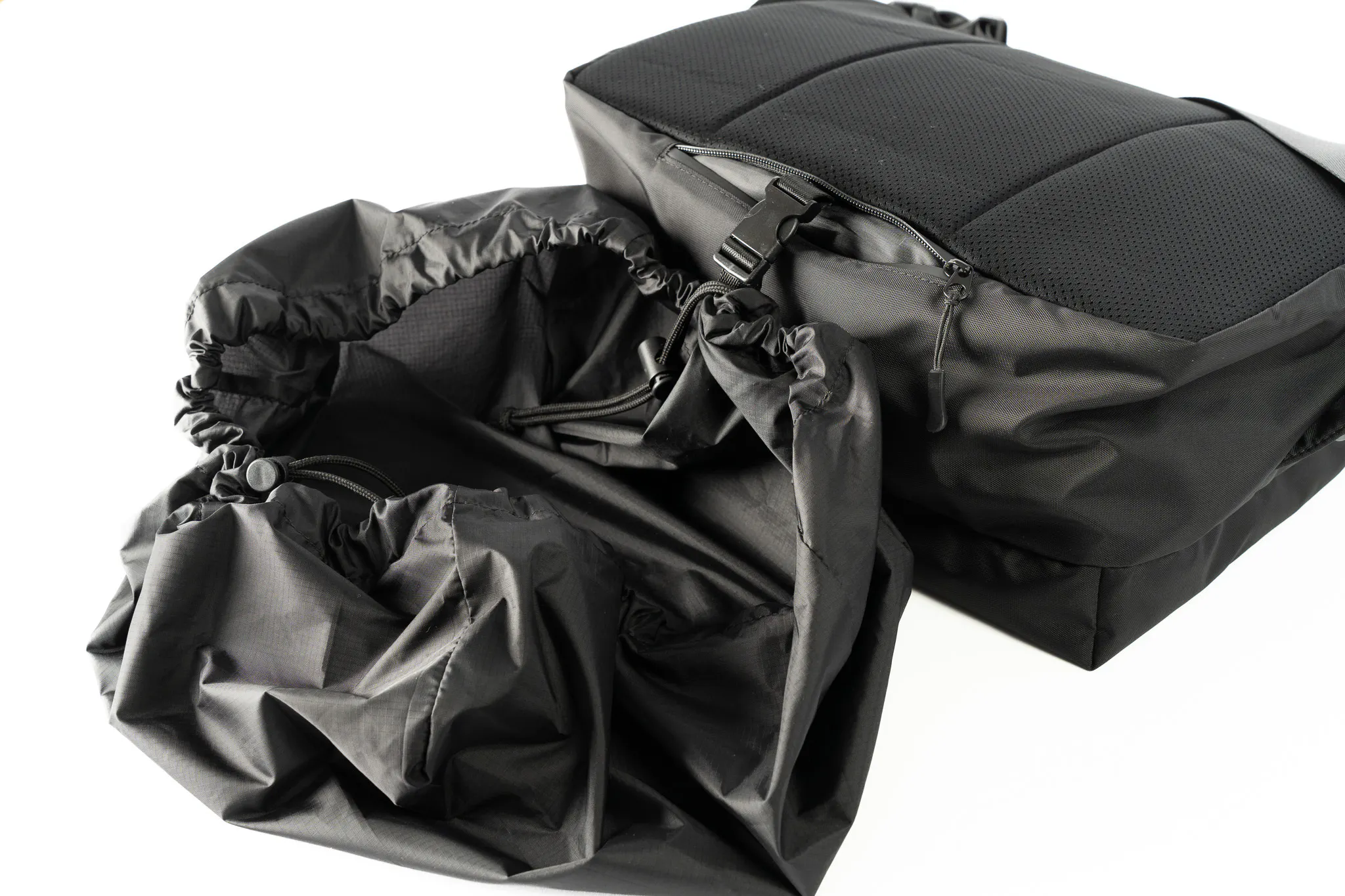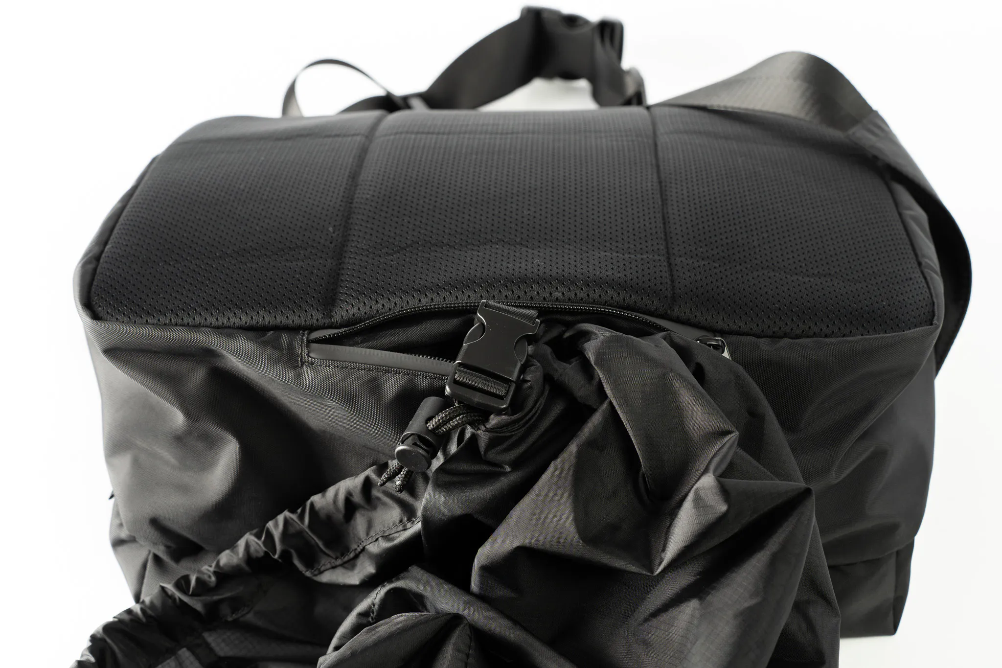 ご覧の通り、バッグ本体を包んでしまえば、大雨でも恐れるに足らず。都市生活での使用をメインに置きつつ、ちゃっかりアウトドアでも重宝する機能を盛り込んでみました。