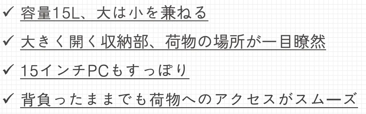 大きすぎず、小さすぎない。余計なものを削ぎ落としたシンプルかつ合理的な容量15L。でも必要な機能は全部これひとつに。