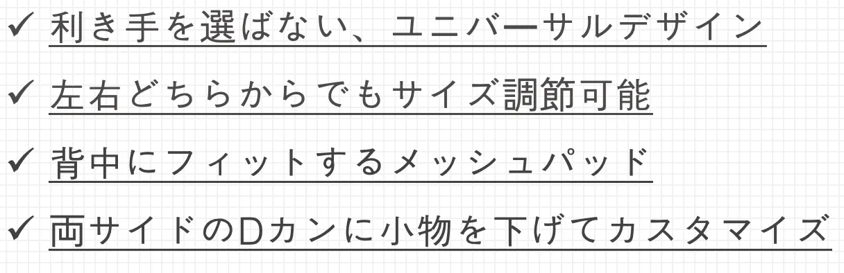 バッグの使い勝手を大きく左右するのが、ショルダーストラップ。どちらの肩にも掛けられるユニバーサルデザインで、利き手を選ばず、左右どちらからでもストラップの長さ調整ができるよう仕上げました。