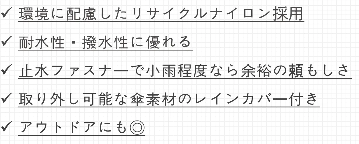 環境への配慮も欠かさず、本体の素材には廃棄されたペットボトルを原料とする、リサイクルナイロンを採用。耐久性とエコフレンドリーを兼ね備えているだけでなく、撥水性にも優れた現代のライフスタイルにぴったりな素材です。
