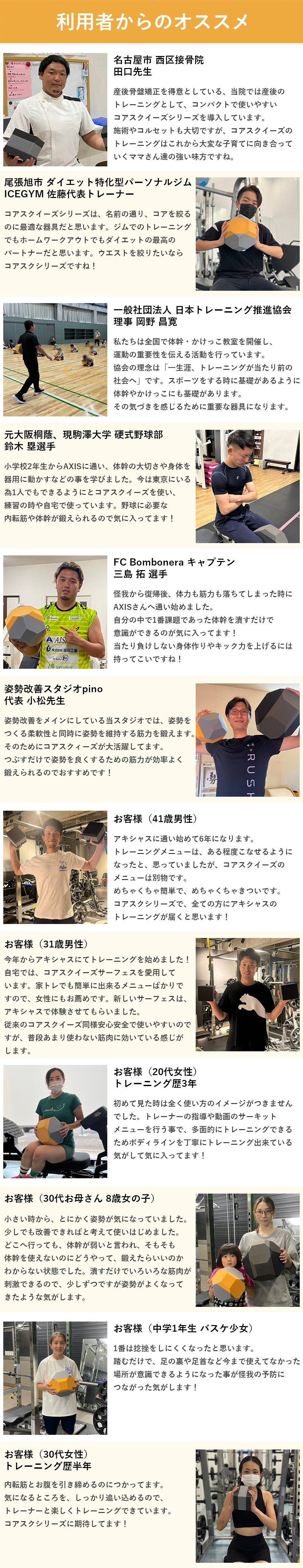 その強い思いを「コアスクイーズ」というプロダクトを通してお伝えしてきました。私たちはトレーニングするための「モノ」を売って終わりではなく、購入いただいた後もいかにしてトレーニングを継続して行っていただけるかにこだわってきました。この想いをもっと多くのお客様に届けたい!そう考えコアスクイーズを開発いたしました。
