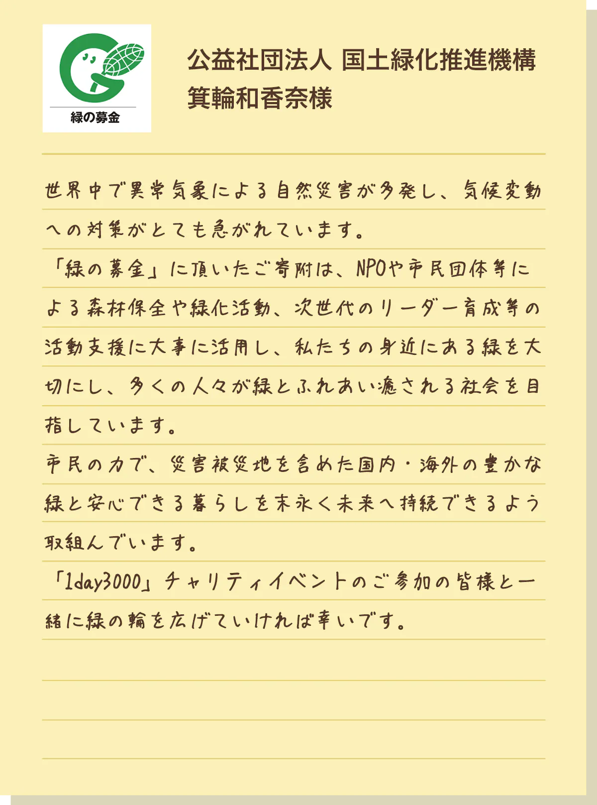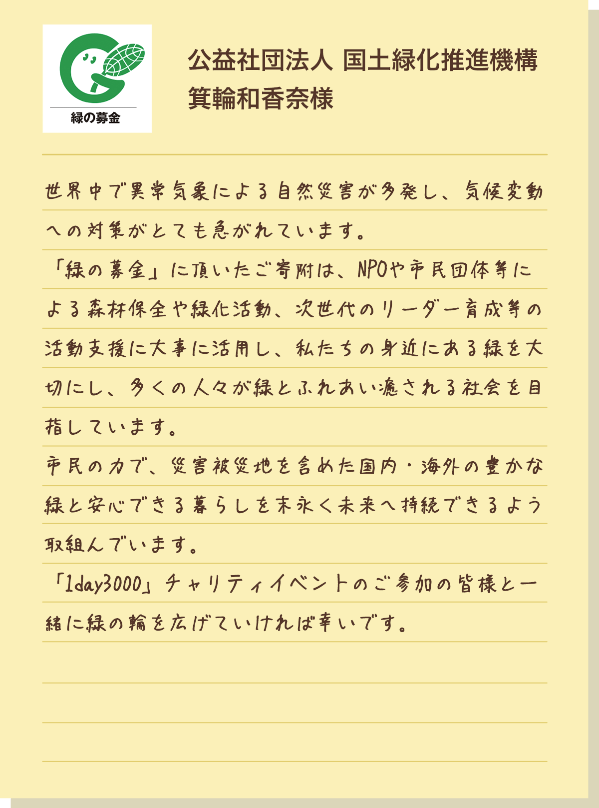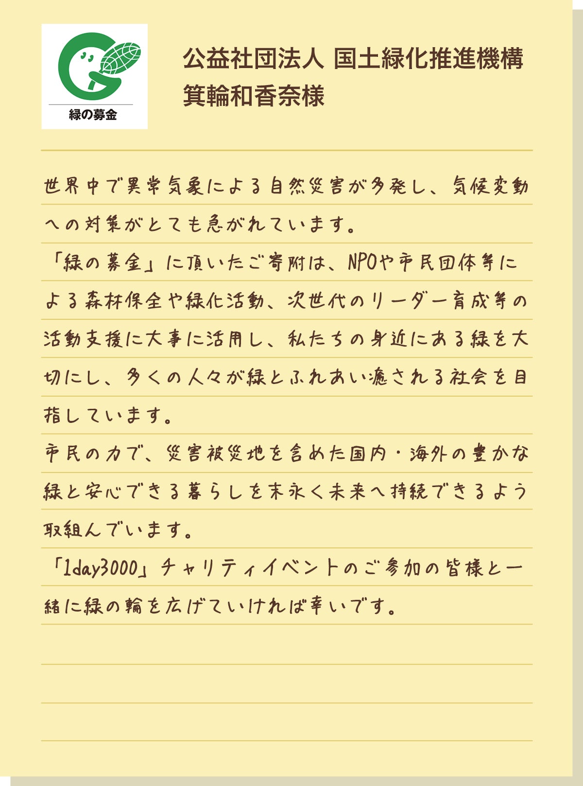 災害被災地を含めた国内外の森林の保全や緑化の推進につながっています。