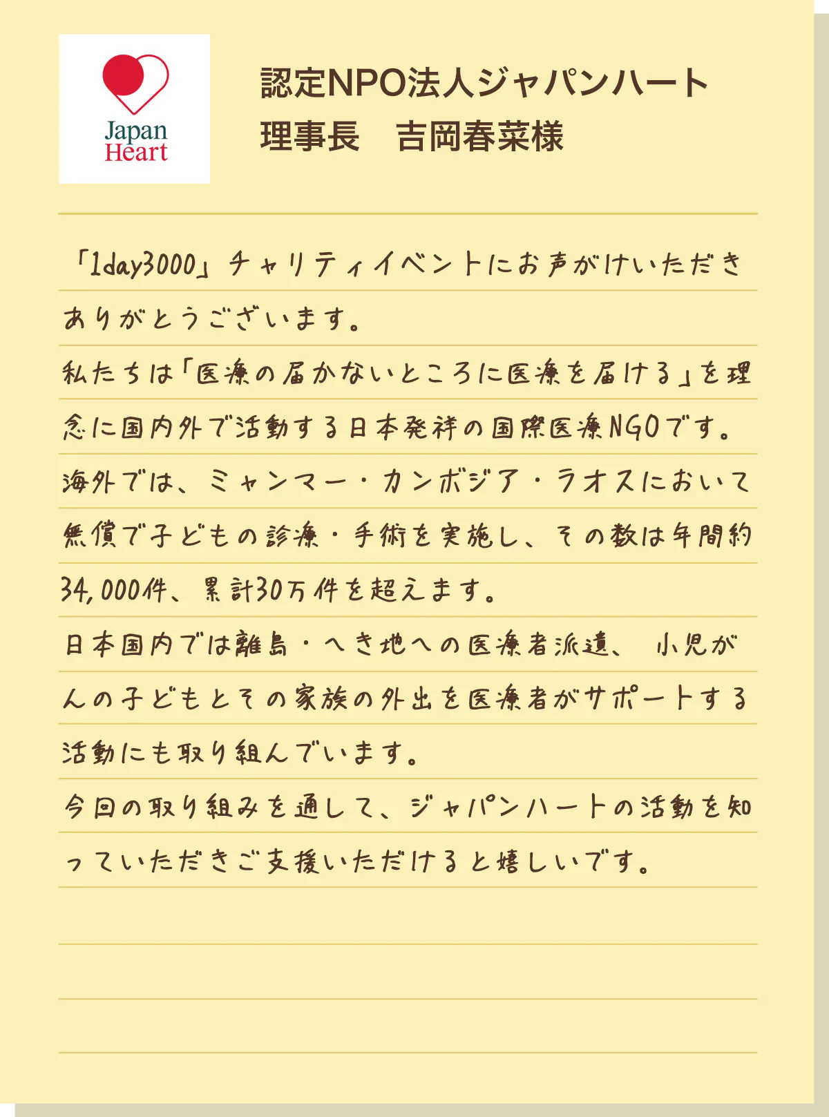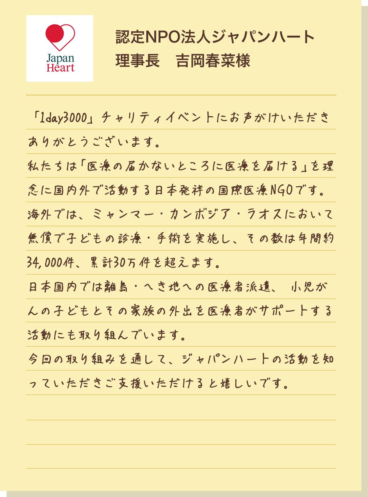 認定NPO法人 ジャパンハートは、「医療の届かないところに医療を届ける」を理念に活動するNGOです。