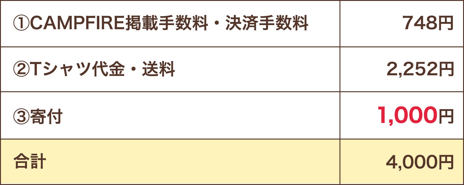 残りの3,000円は、Tシャツの代金・送料とCAMPFIRE掲載手数料・決済手数料となります。