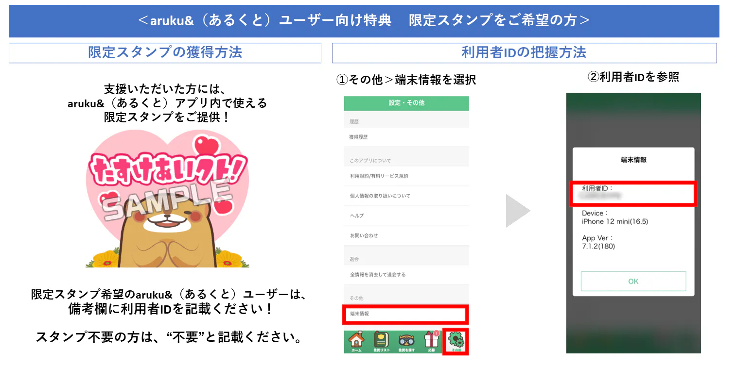 支援いただいた方のうち、aruku&(あるくと)アプリの”利用者ID”を備考欄に記載いただいた方には