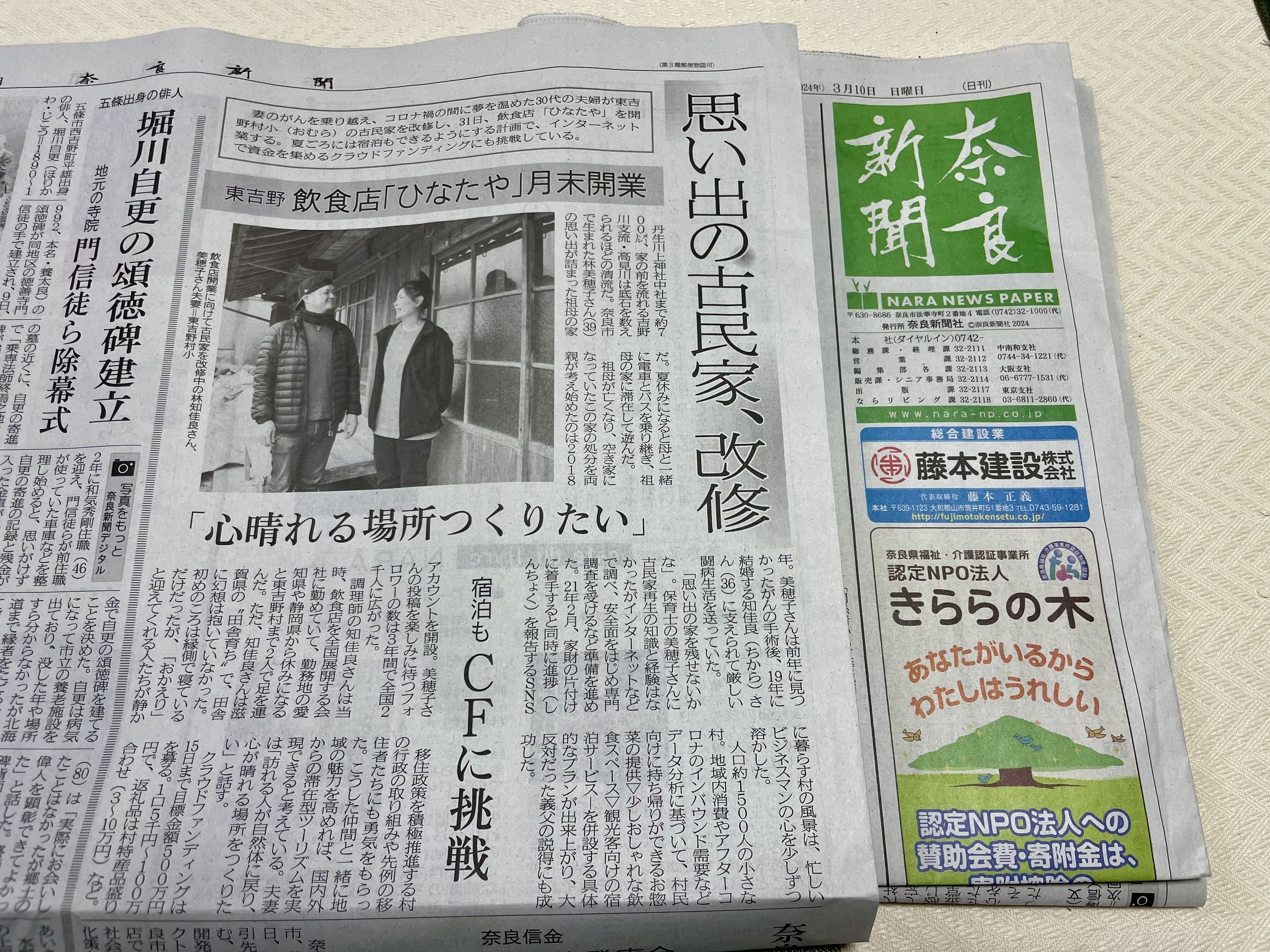昨日は、新聞に大きく取り上げていただき、早速たくさんの反響もいただいております!奈良新聞社、木之下様。素敵な記事にしていただきありがとうございます!デジタル版はコチラから