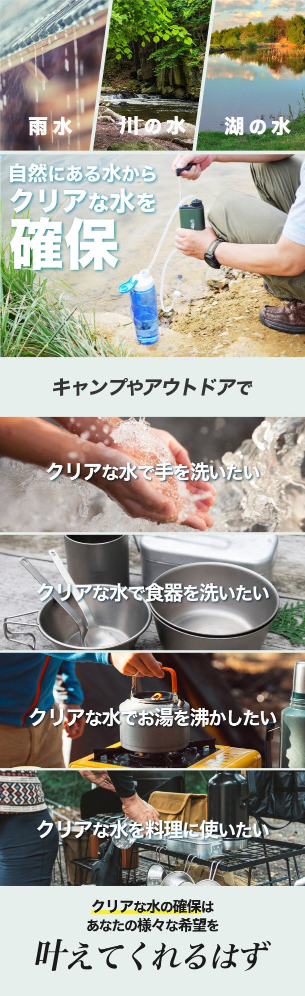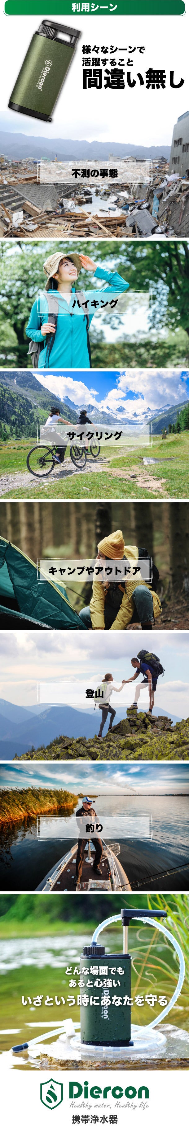 私たちのすべての製品は、安全で信頼性があり、初めて使用する方にも簡単に取り扱えることを心がけております。また、例えば、アウトドアや軍隊の訓練、ハイキング・サイクリング・ハンティング・キャンプ・登山・釣り・災害などさまざまな使用シーンにも簡単に持ち運び可能で、安全な飲料水を提供できるようなプロダクトを製作しております。