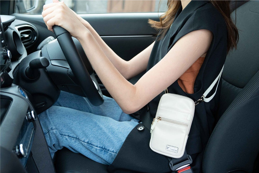 肩から下げておいて運転すれば、スマホの置き場所に困りません。