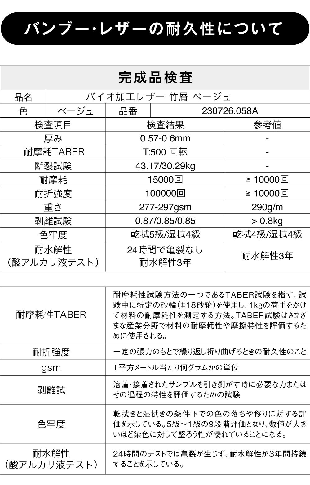 その竹屑と水性PU(水溶性ウレタン樹脂の総称)を合成して作られており、従来の合成・人口皮革よりも石油由来の原料の使用を抑えています。