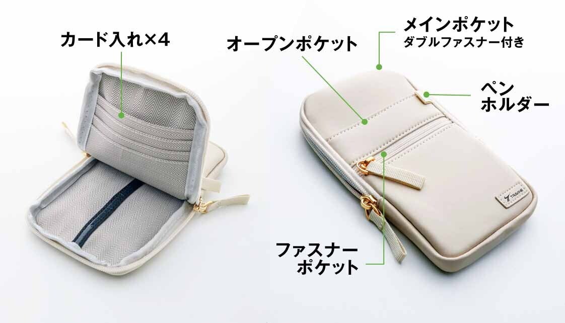 また、ロングファスナーで「がばっと開く」を実現し、スマホやカードが取り出しやすくなっています。