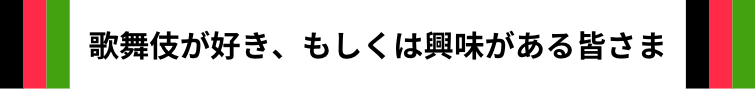 もしくは、歌舞伎は敷居が高いけれども興味はあると思っている方。この企画を通じて、観客側として歌舞伎に参加する楽しさや独自の面白さを知って頂けたらと思います。